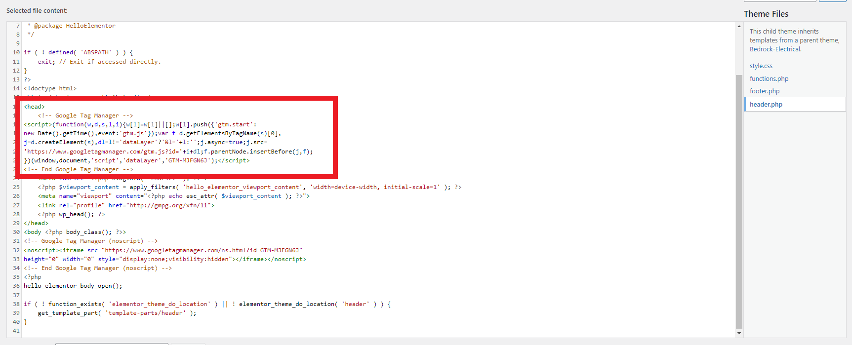 - Go back the the tab where you have opened the header.php file in WordPress, then paste the first container snippet immediately after the first <head> tag that you see. NOTE: Make sure you do not highlight anything in the header.php file before pasting. Doing so and saving the file can break the site.