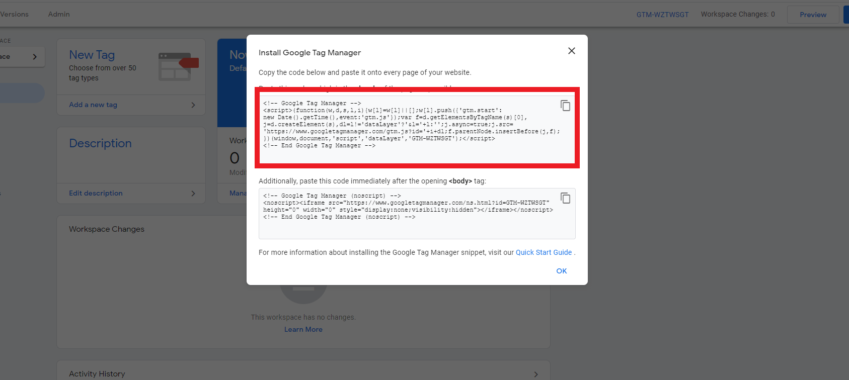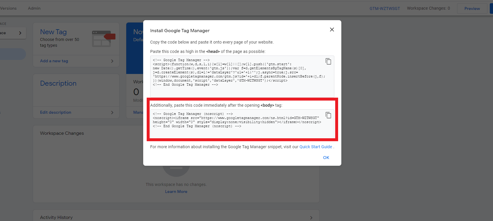 - Go back to the Google Tag Manager tab in your browser, and copy the second container snippet.