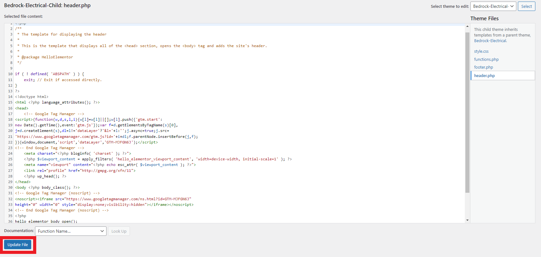 - Once both container snippets have been pasted in the header.php file, click the Update File button.