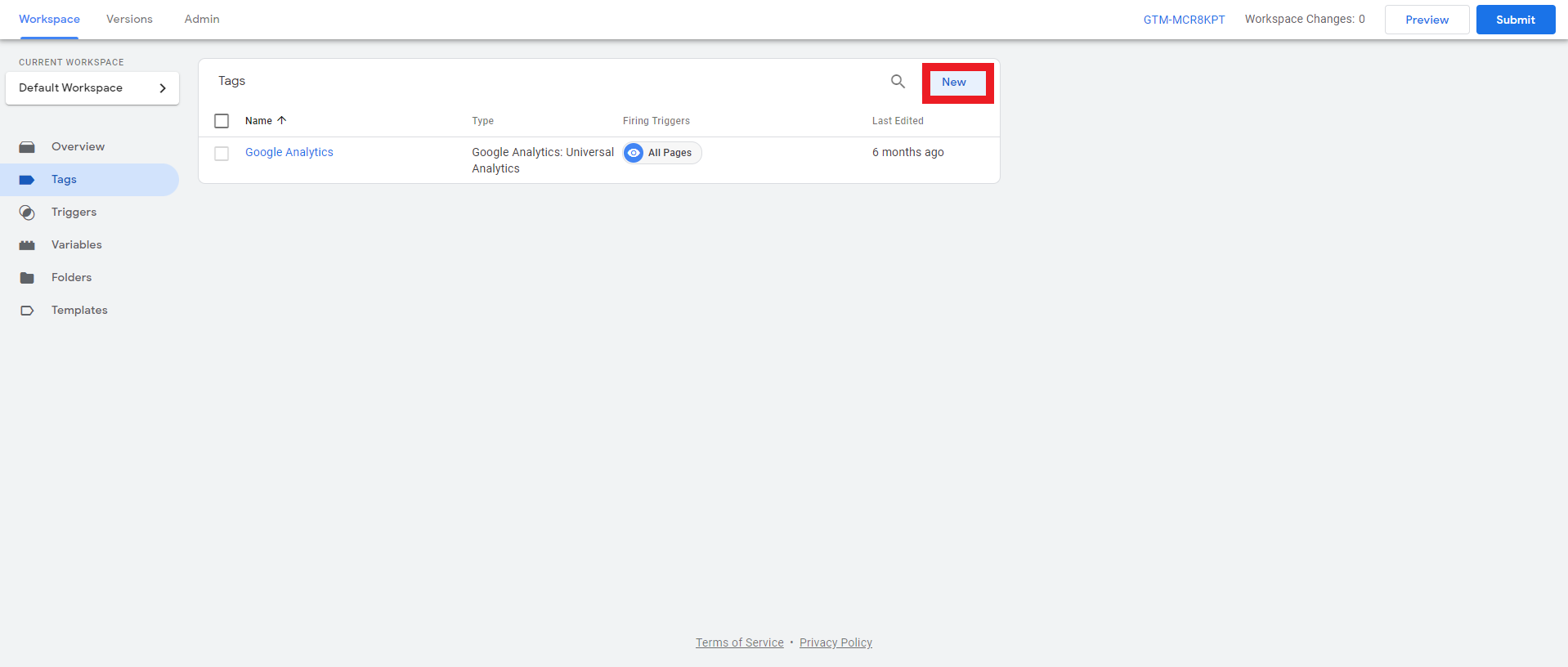 - On the Tags screen in Google Tag Manager, click on the New button.