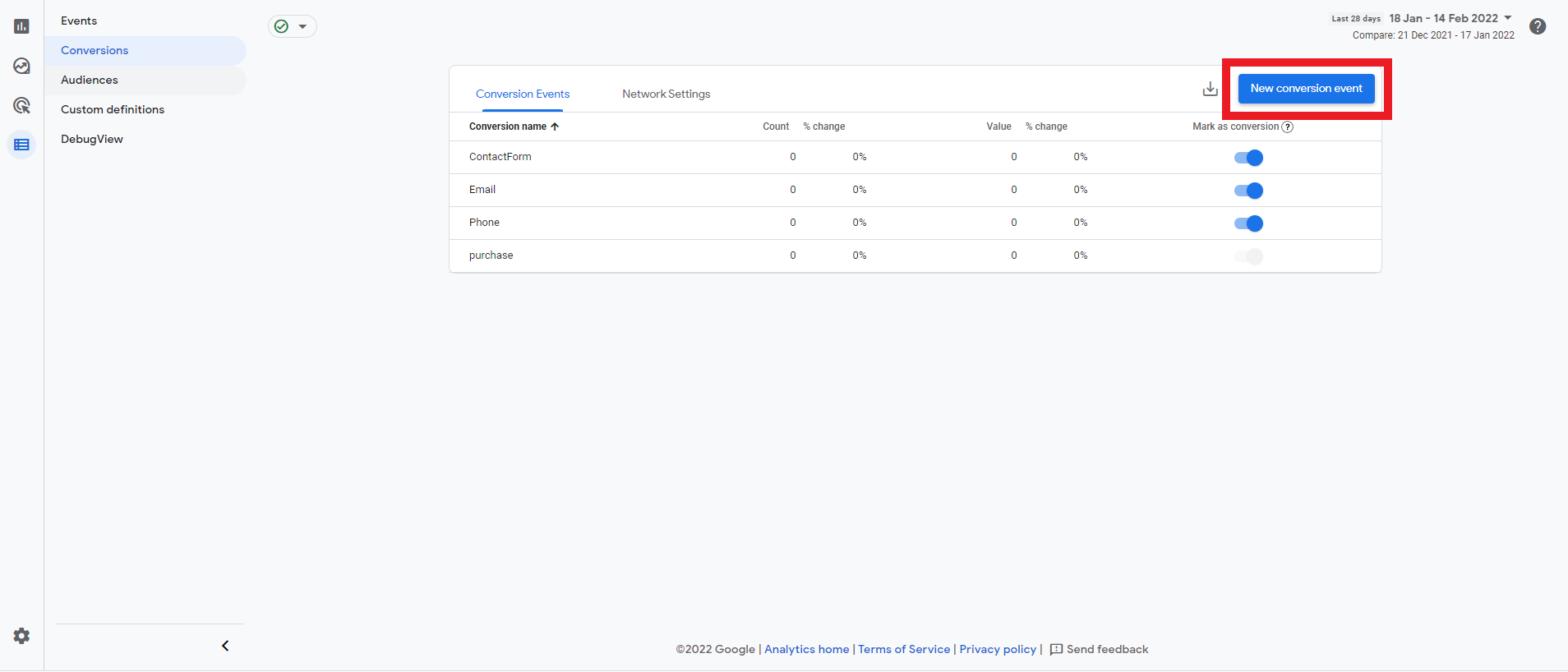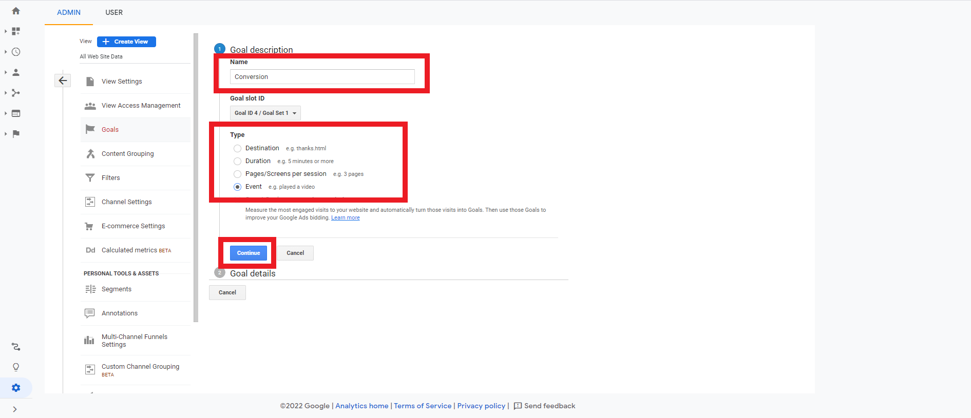 - In the Name field, enter the name of the conversion action (Phone, Email, Contact Form, Newsletter Signup, etc.). Then select Event as the conversion type, then click the Continue button