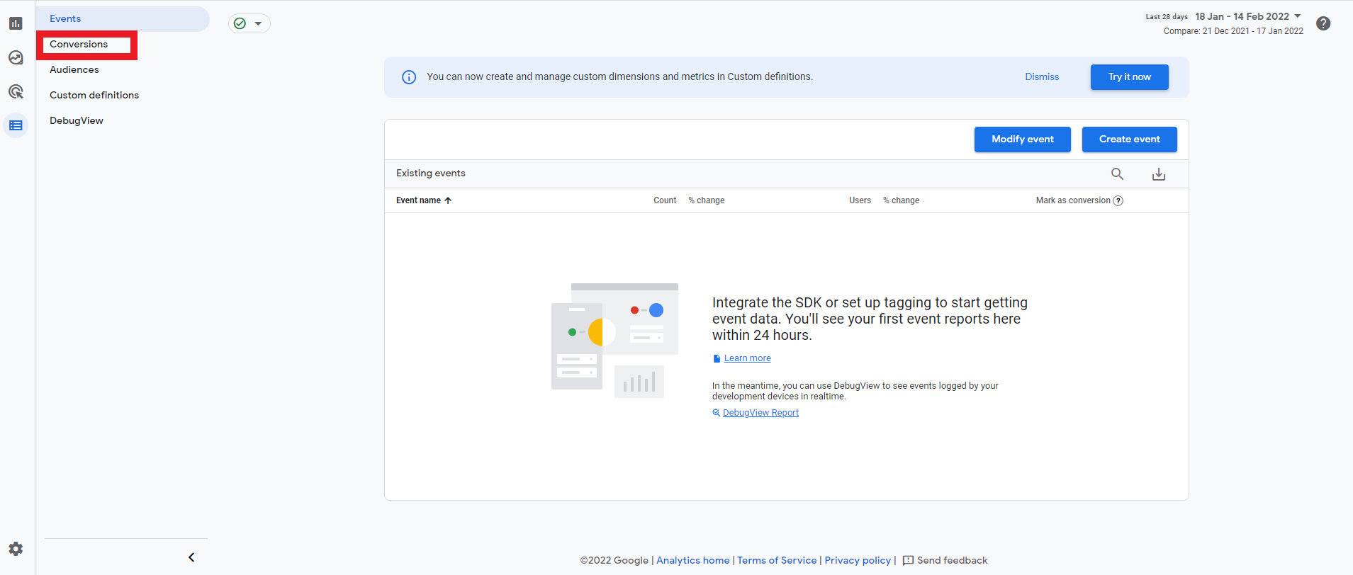 - In the Google Analytics account, select Configure in the left-hand menu, then select Conversions.