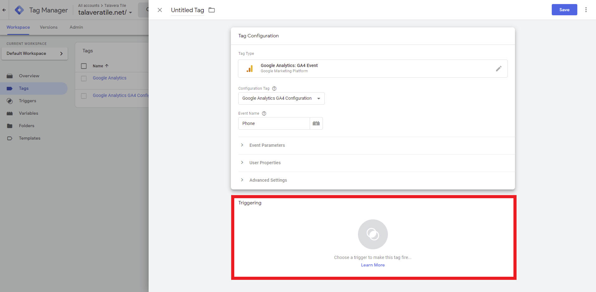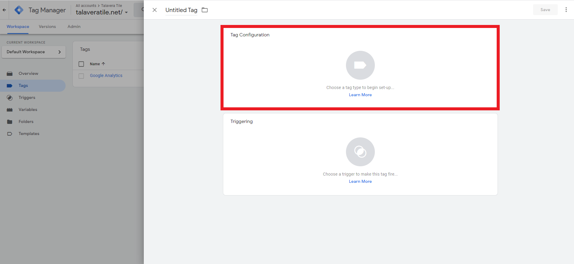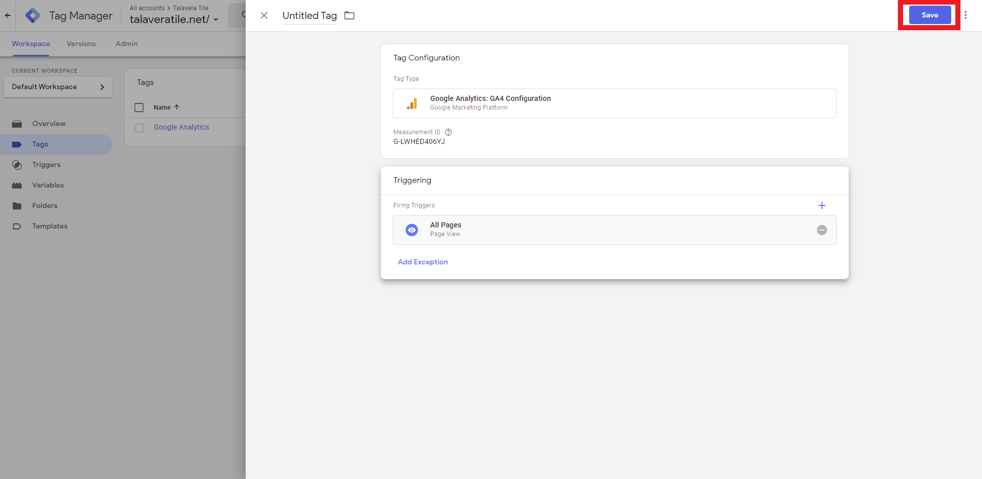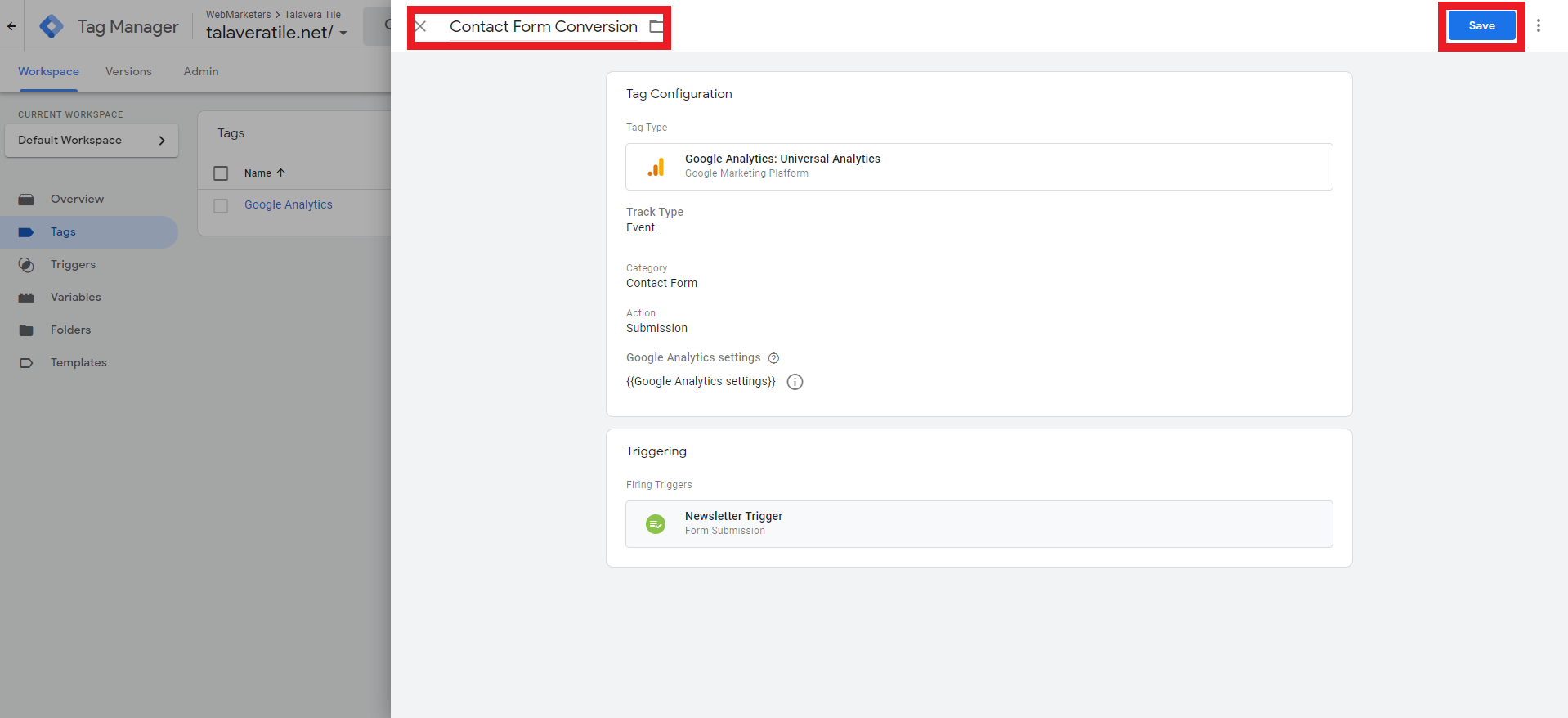 - Back on the tag creation screen, click the Save button, then click Save on the following popup.