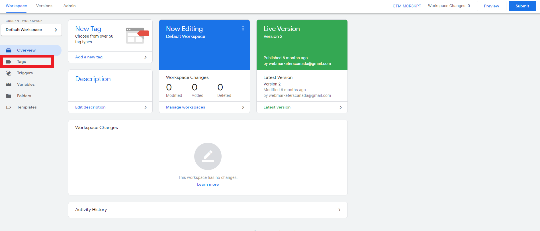 - In the Google Tag Manager account dashboard, click on the Tags tab.