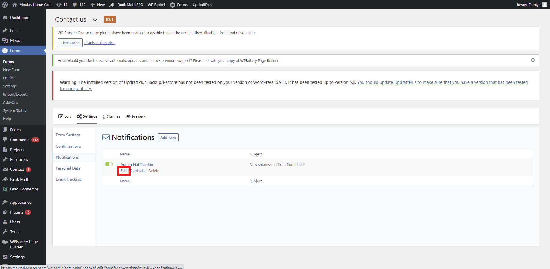 - On the Notifications screen, hover over the Admin Notification and click Edit.