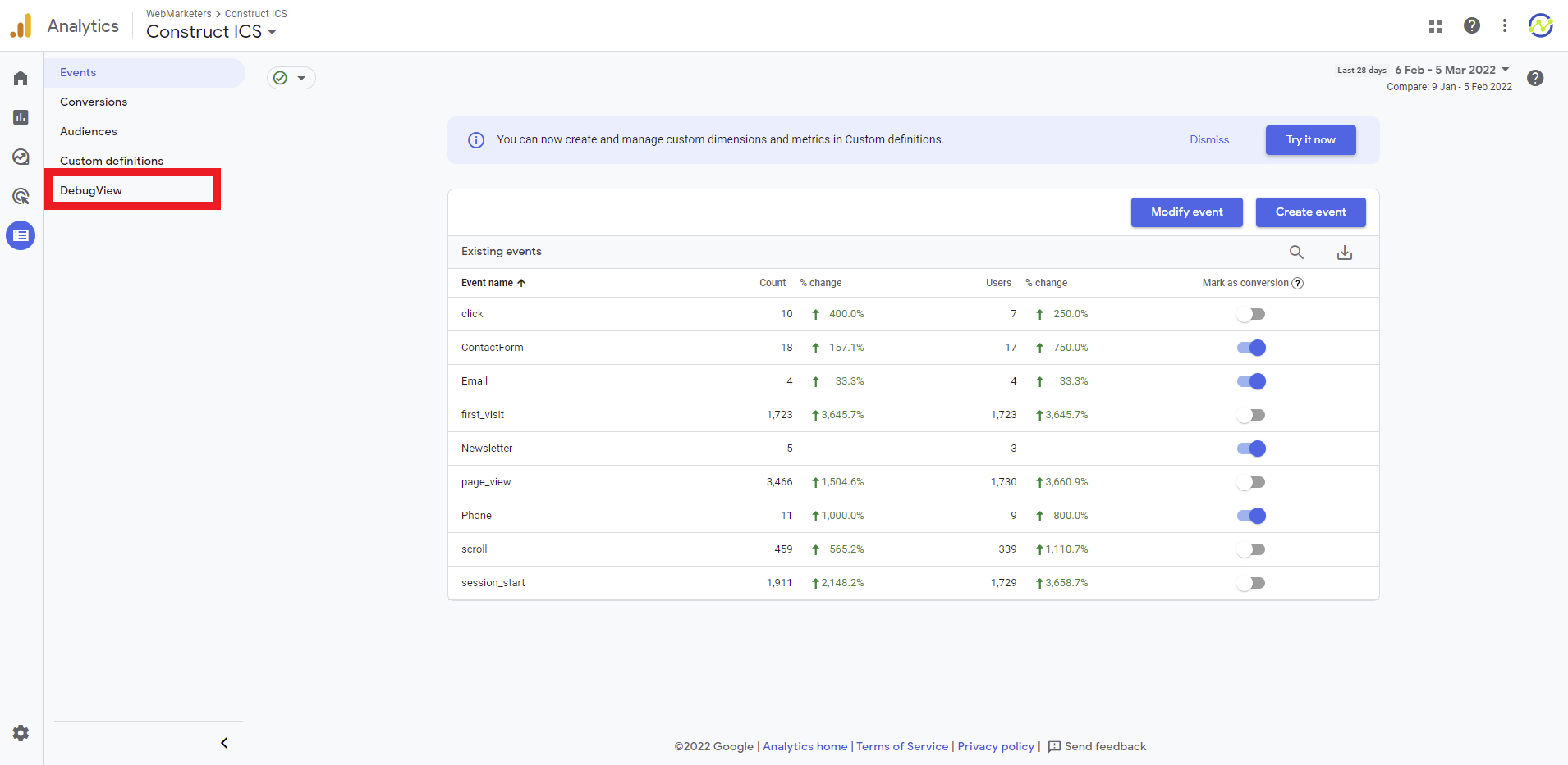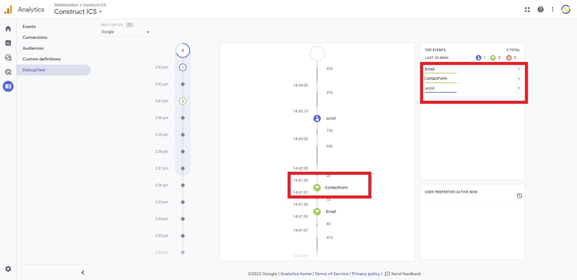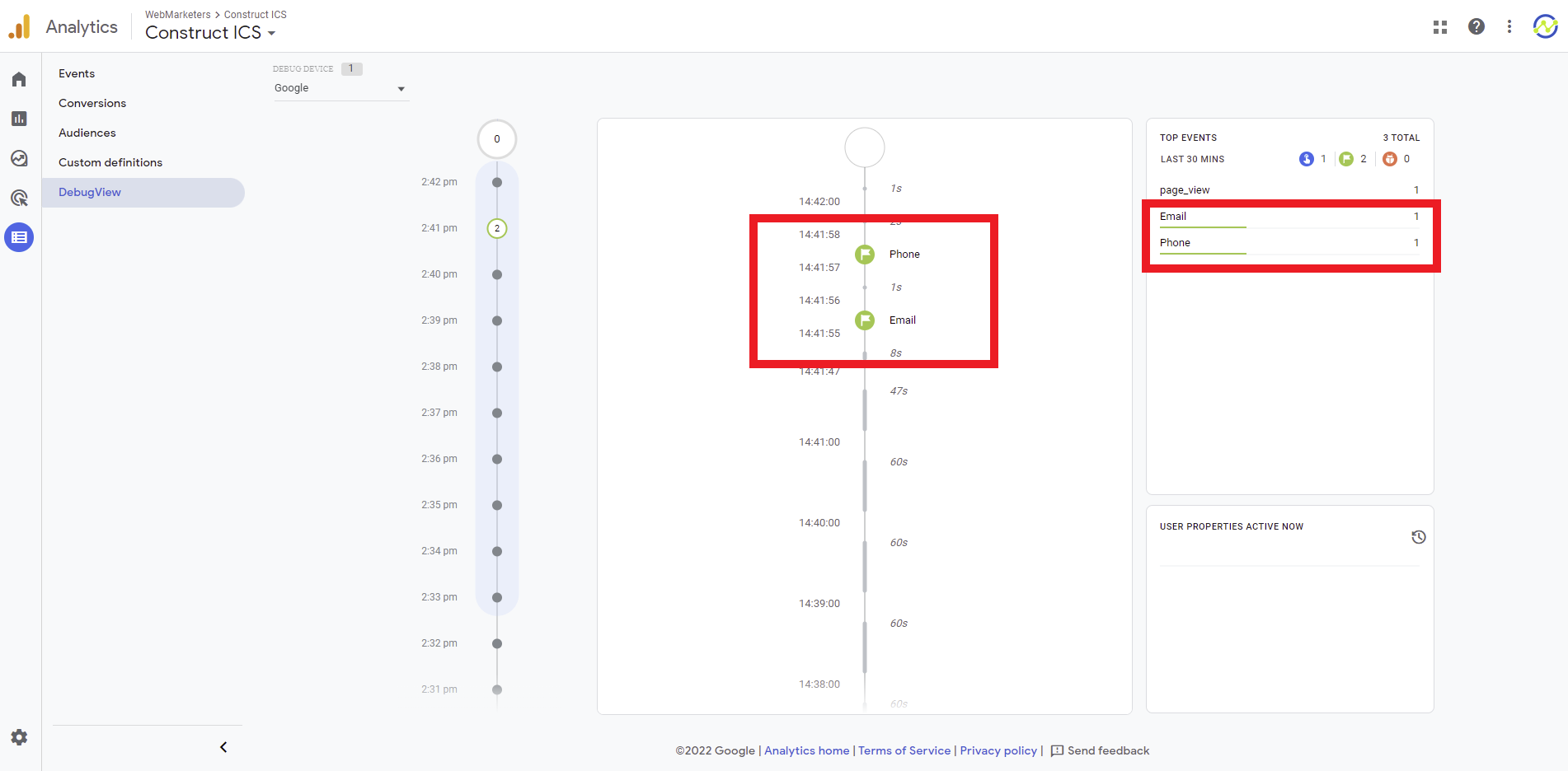 - Switch your browser tab to the Google Analytics account and check to see if the Phone & Email conversions registered in DebugView. If the conversions appear, then move on to the next section.