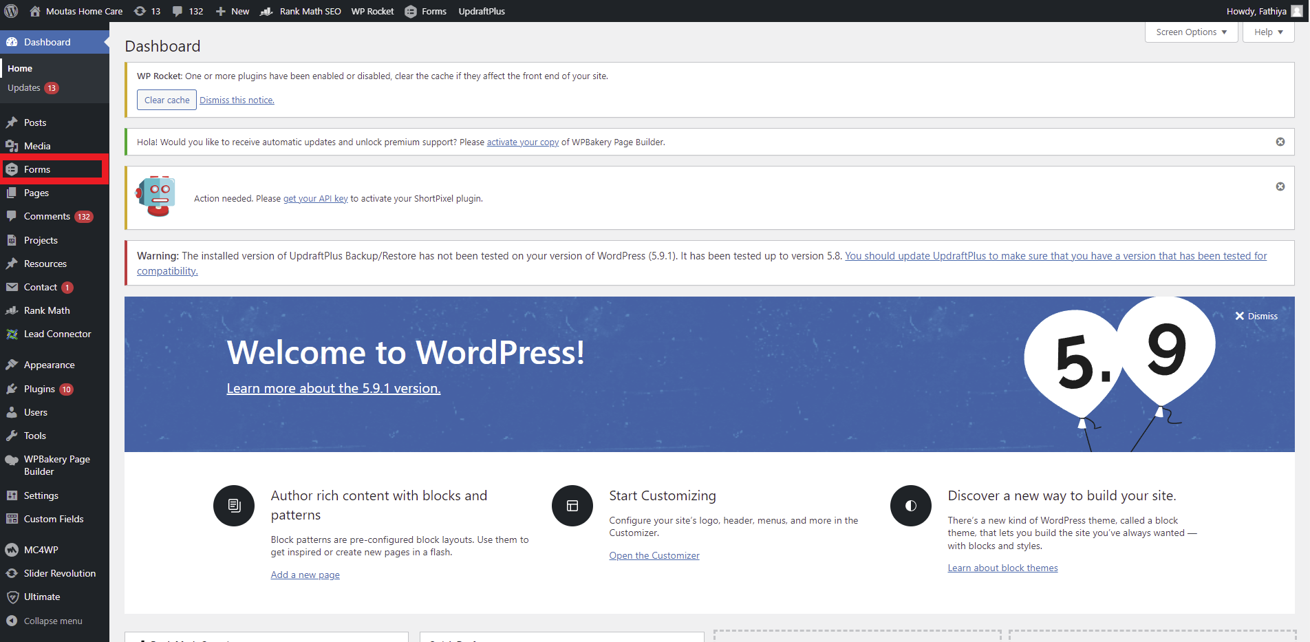 - In a new browser tab, sign into the client’s WordPress. In the dashboard, click on Forms in the left-hand menu.