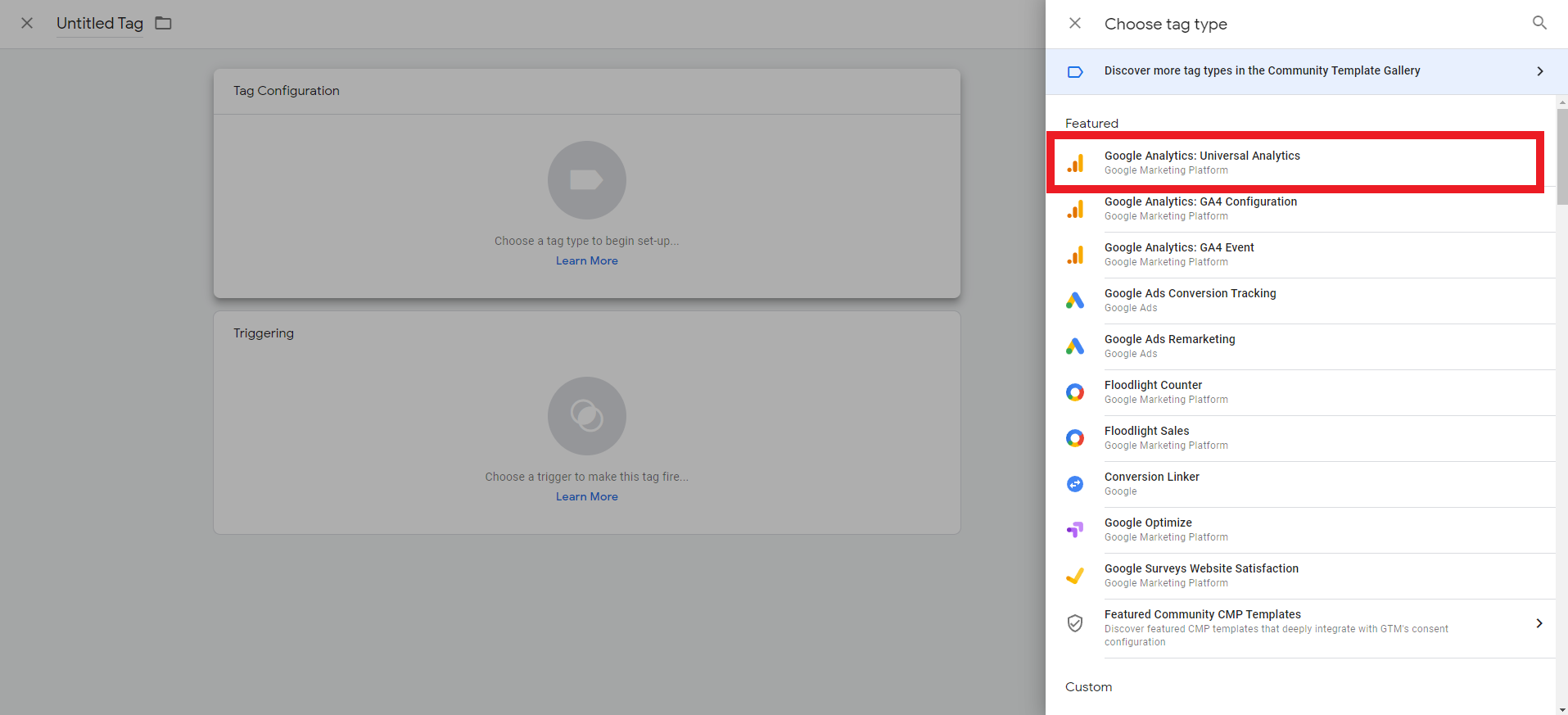 - On the Choose Tag Type menu, click on Google Analytics: Universal Analytics.