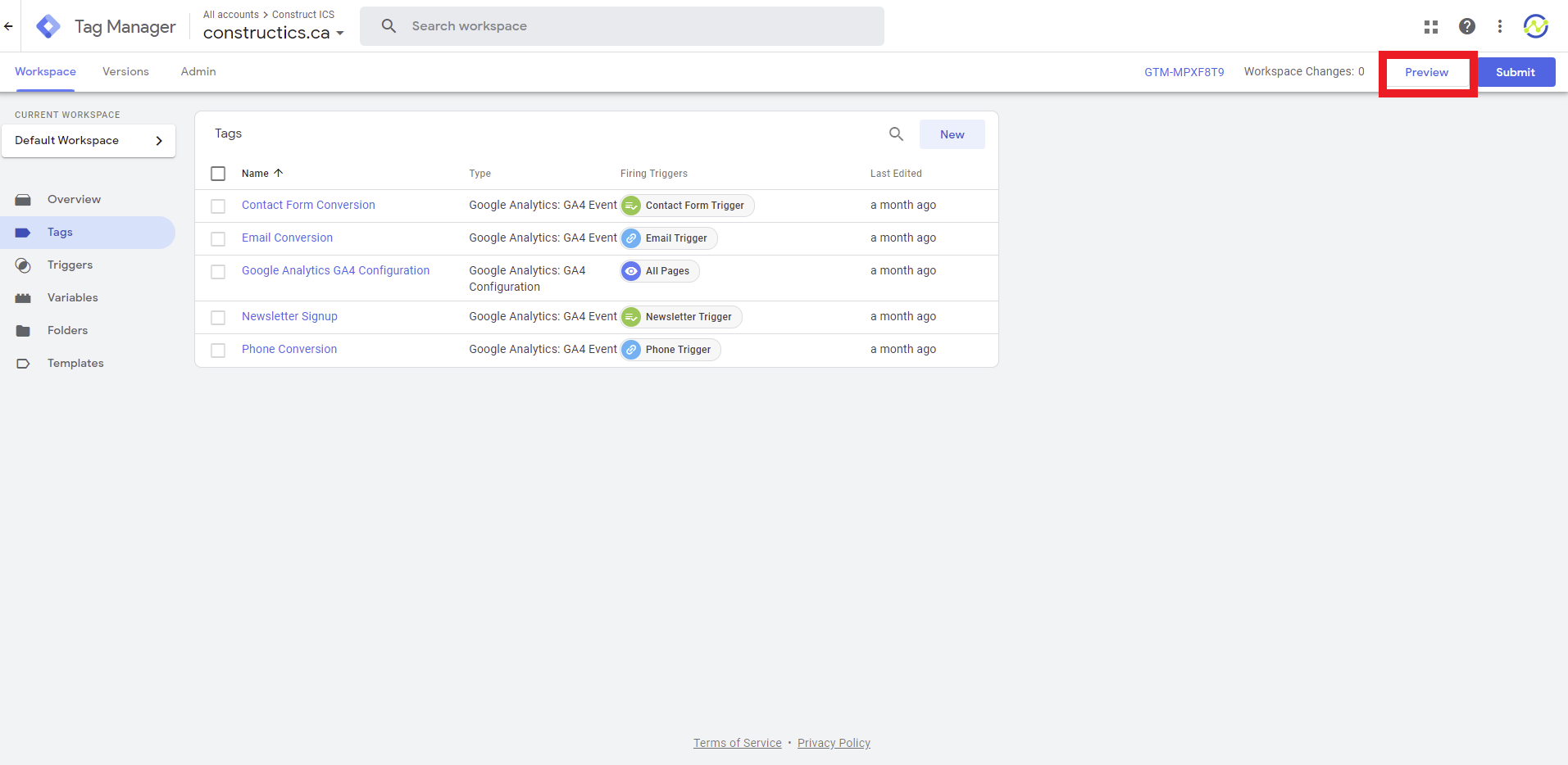 - Switch to the browser tab with Google Tag Manager open, then click the Preview button in the top right corner of the screen.