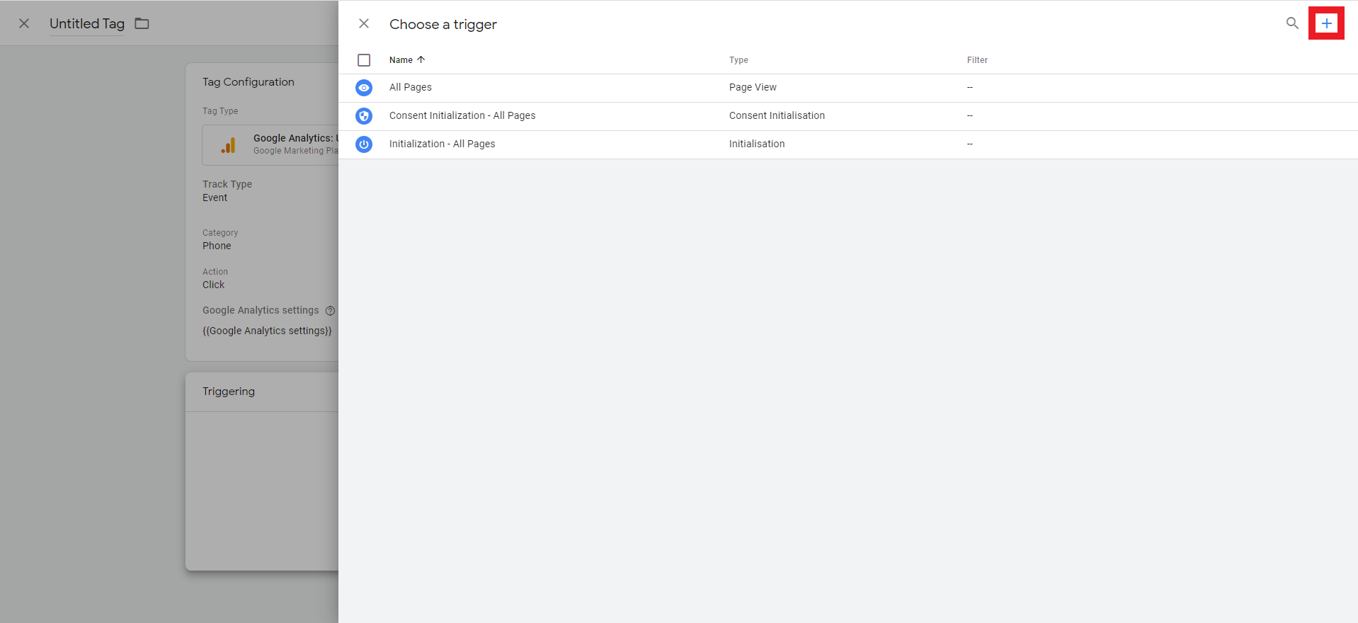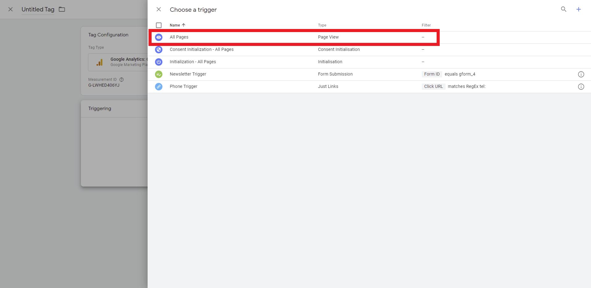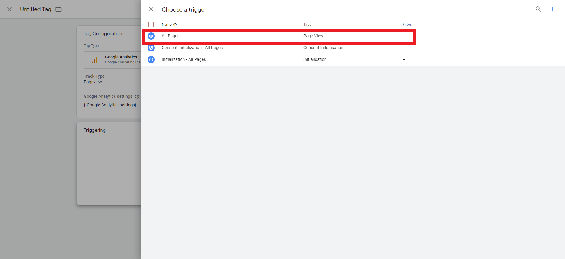 - In the Choose a Trigger screen, select the All Pages – Page View trigger.