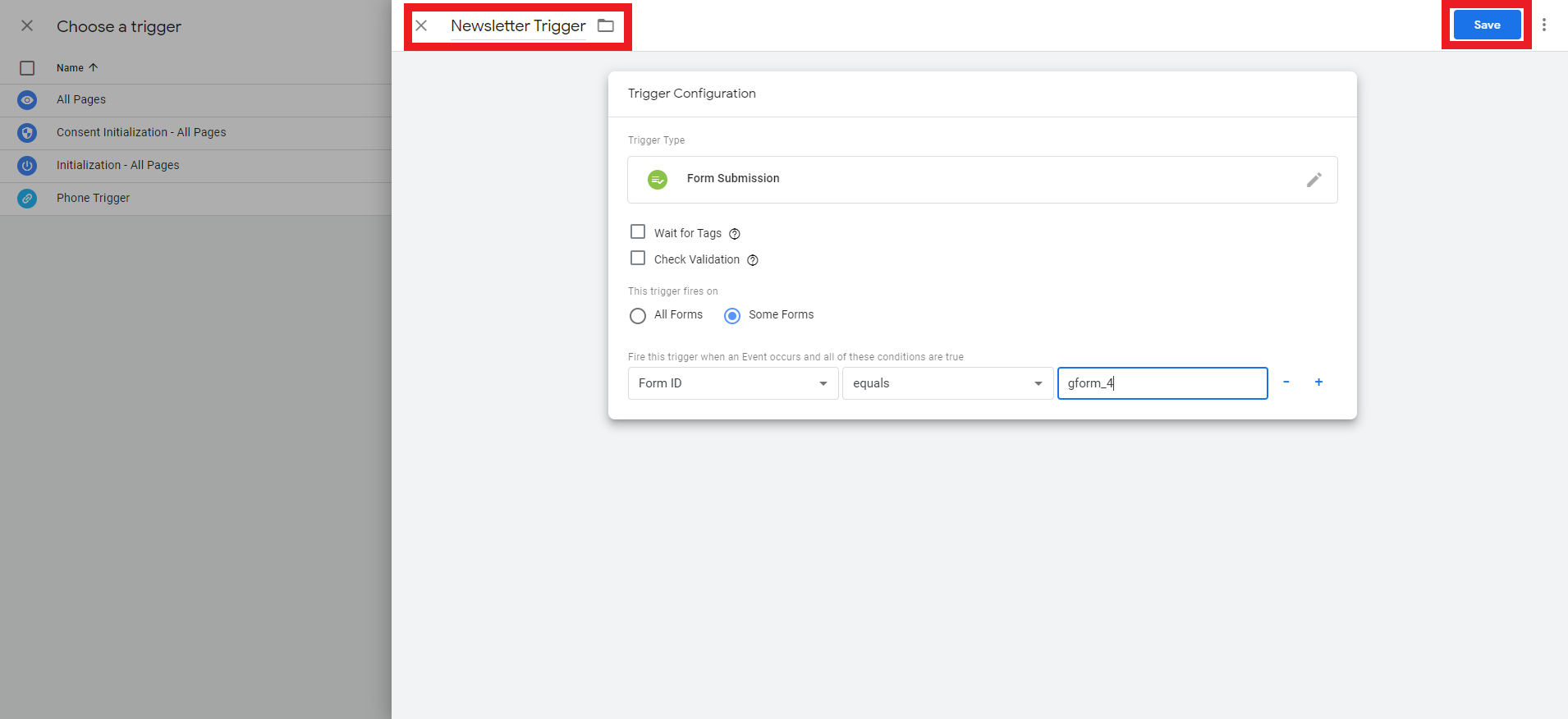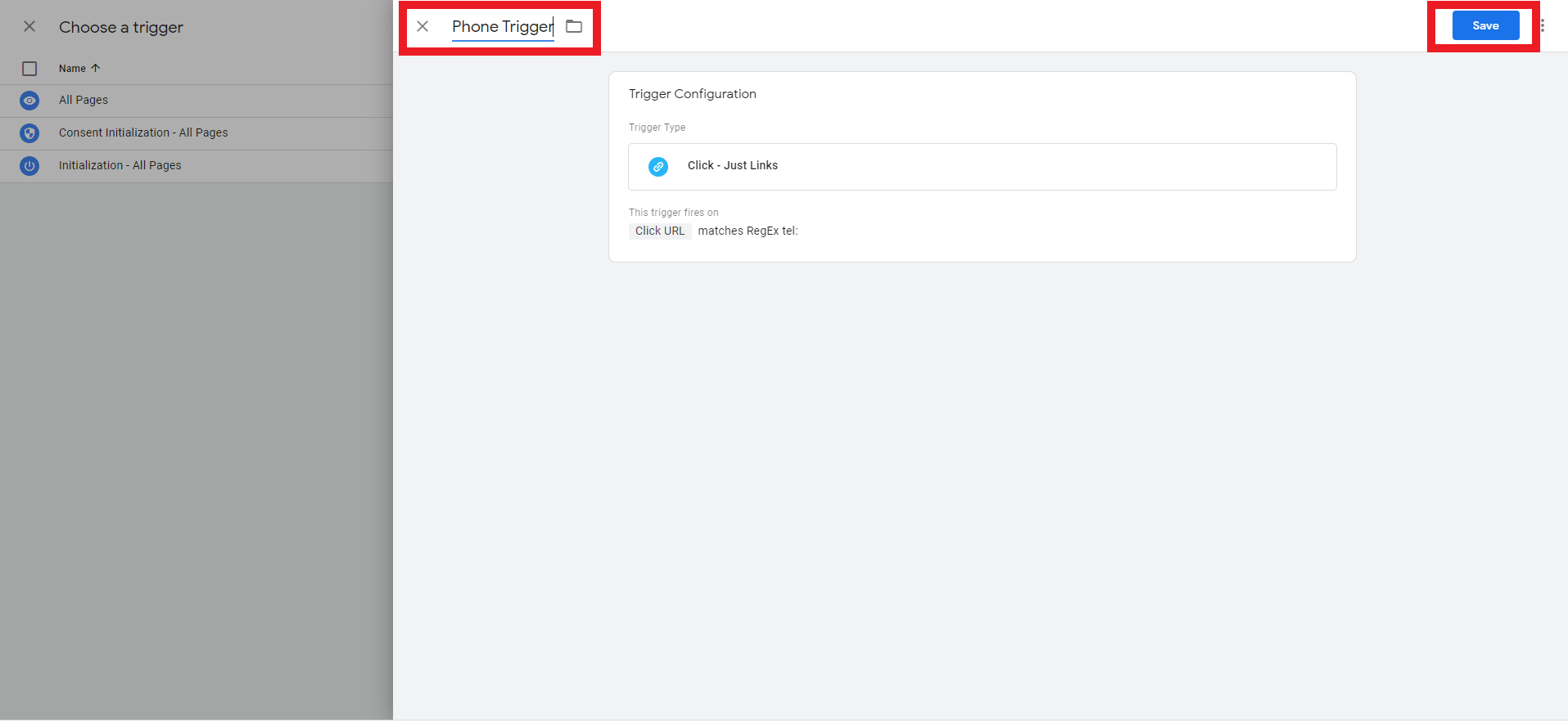 - Replace the “Untitled Trigger” text with the name of the trigger, then click the Save button: