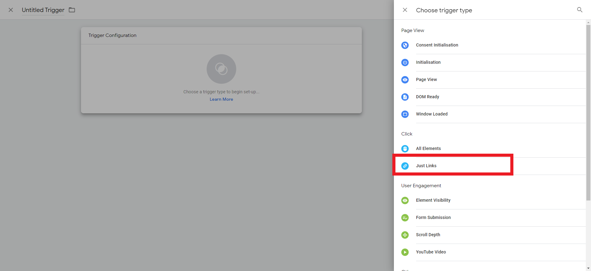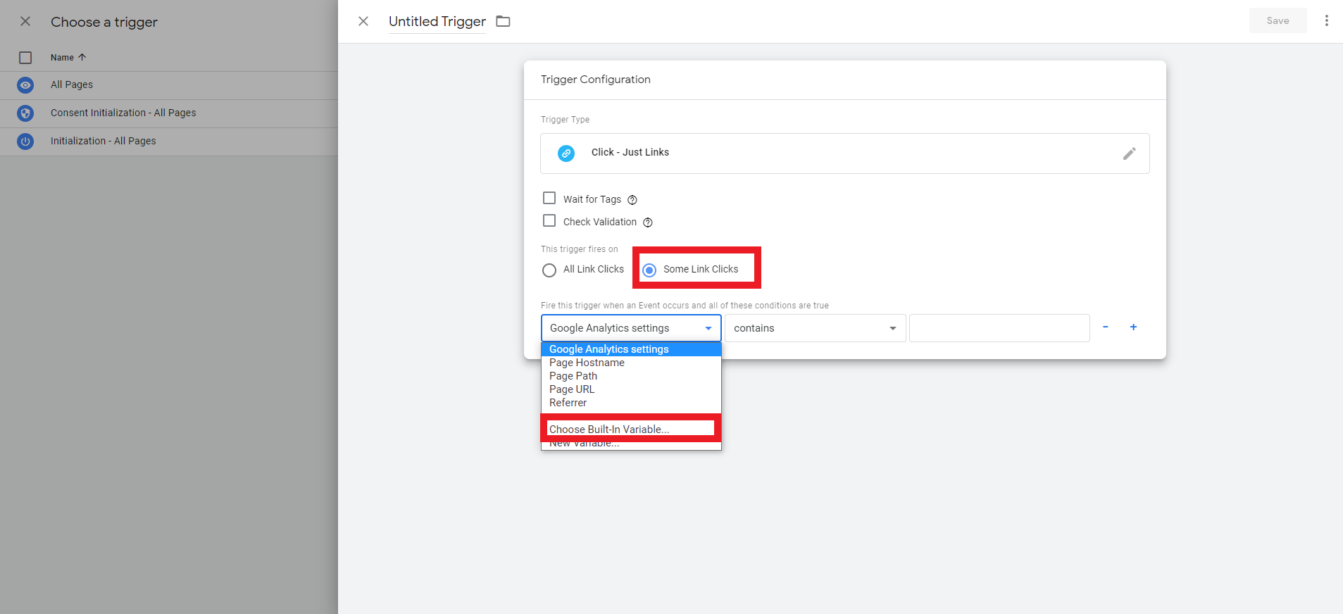 - On the Trigger Configuration screen, click the radio button labelled Some Link Clicks. Then click Choose Built-In Variable in the left-hand dropdown menu.