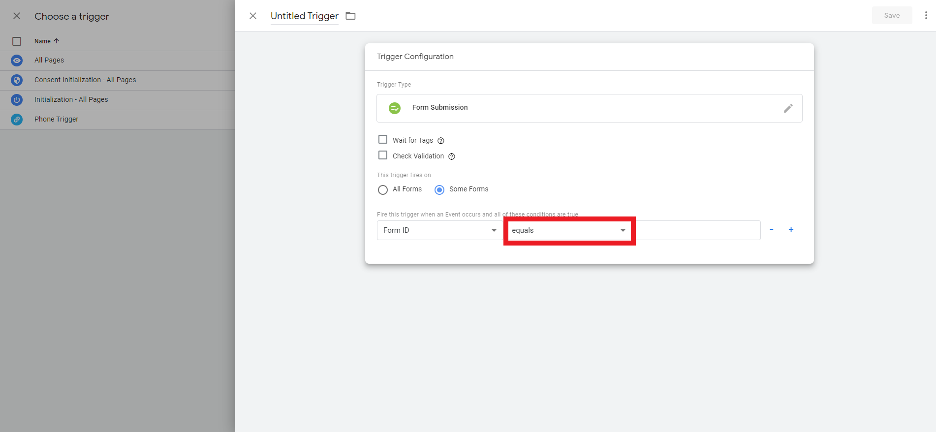 - Back on the Trigger Configuration Screen, set the middle dropdown menu to Does Not Equal.