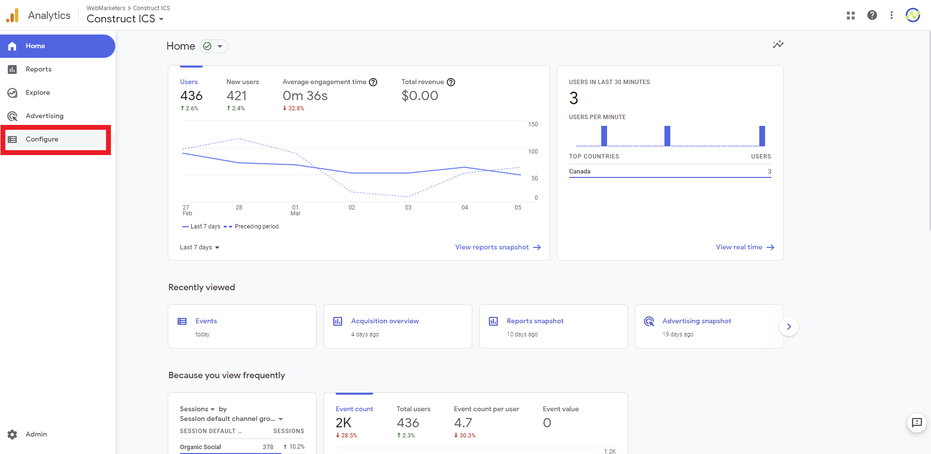 - In the Google Analytics 4 account dashboard, click on the Configure tab in the left-hand menu.
