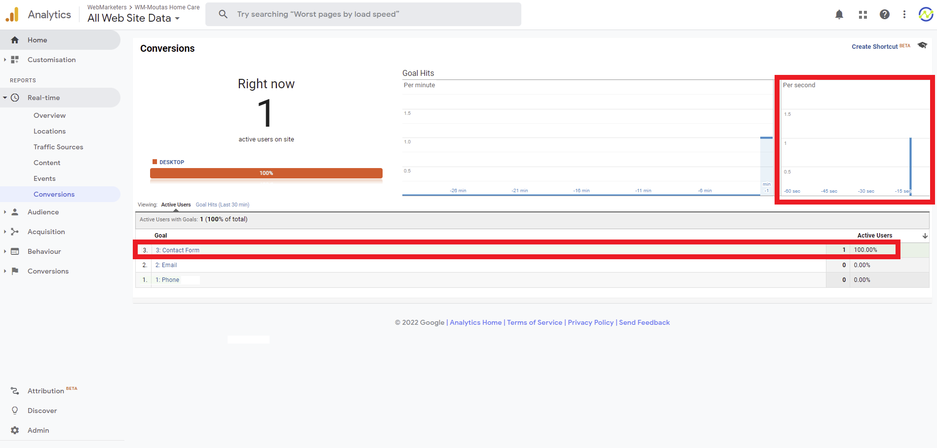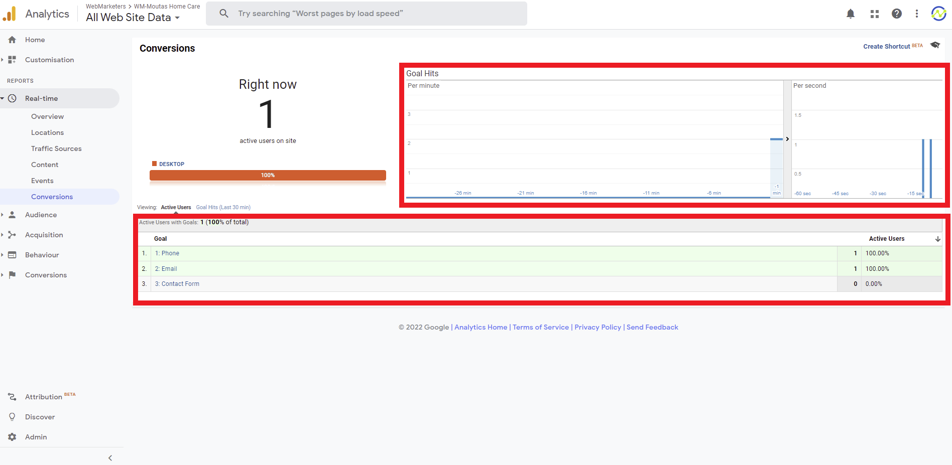 - Switch your browser tab to the Google Analytics account and check to see if the Phone & Email conversions registered there. If the conversions appear, then move on to the next section.