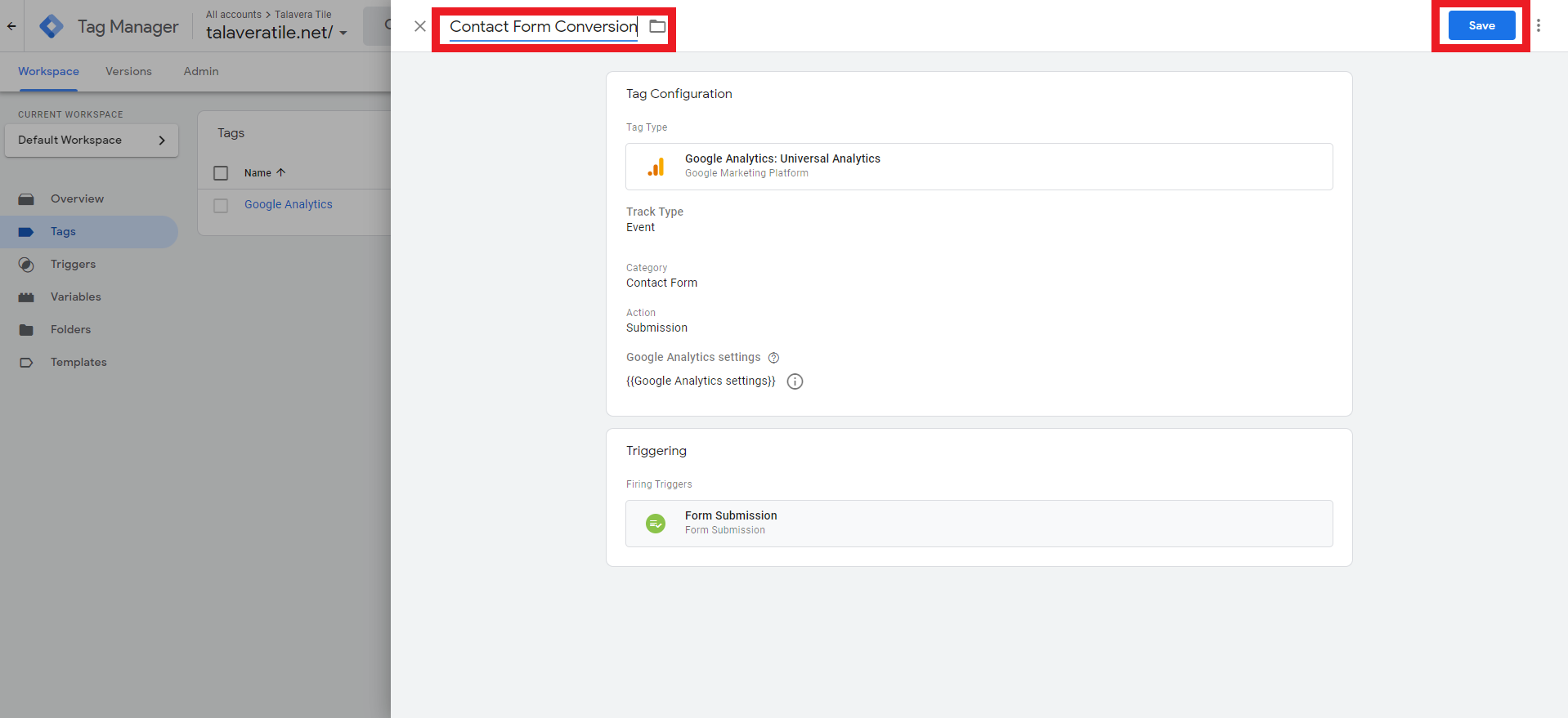 - Back on the Tag Creation screen, replace “Untitled Tag” with “Contact Form Conversion” then click the Save button.