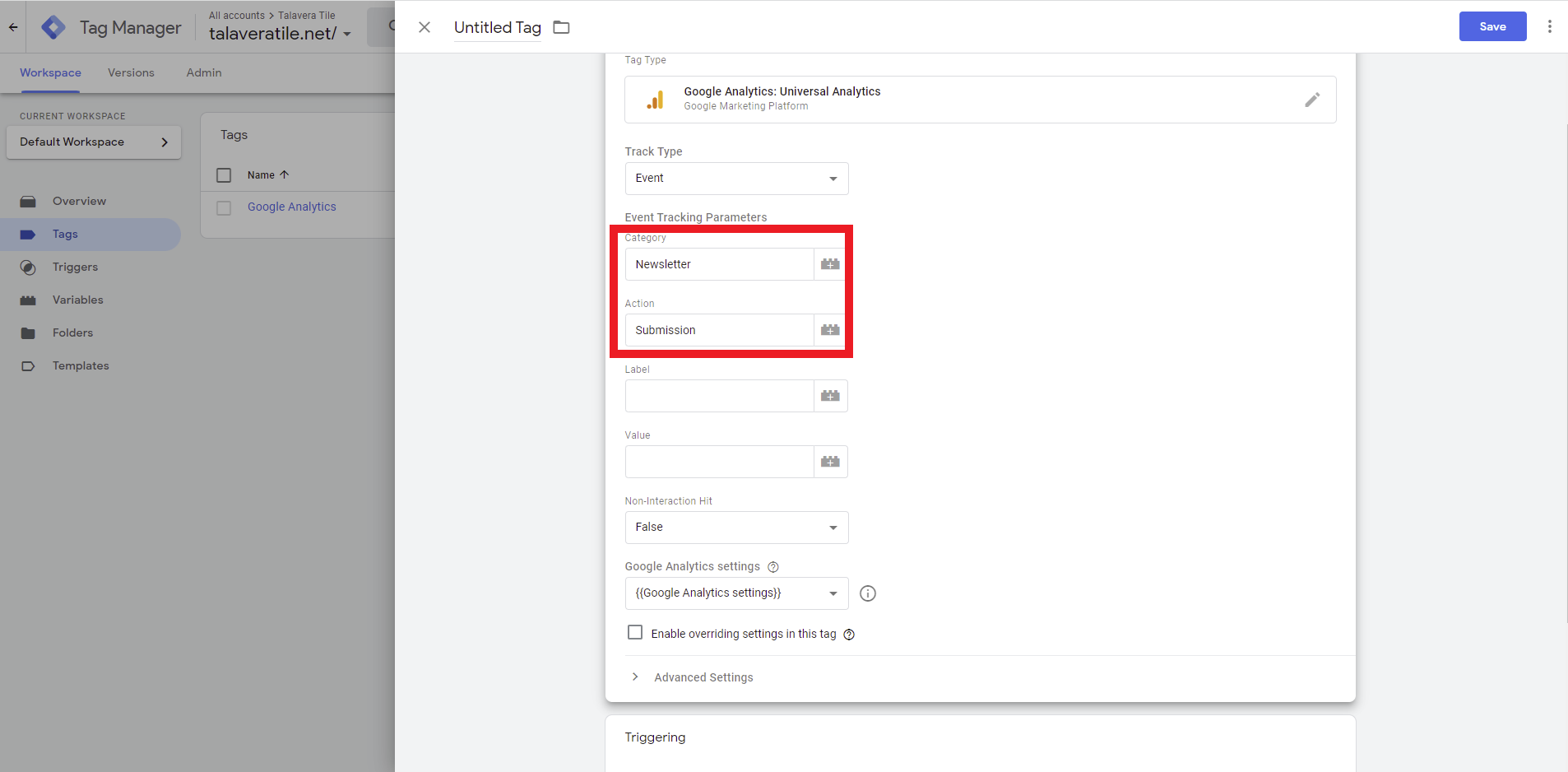 - Back on the Tag Creation screen, replace Untitled Tag with “Newsletter Signup” then click the Save button.