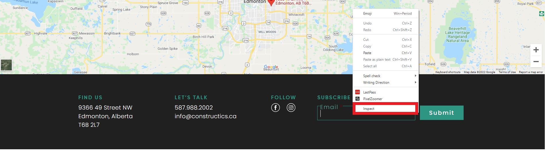 - Switch over to a browser tab with the client’s website open. Find the newsletter signup form, right click on the first text field on the form, then click Inspect.