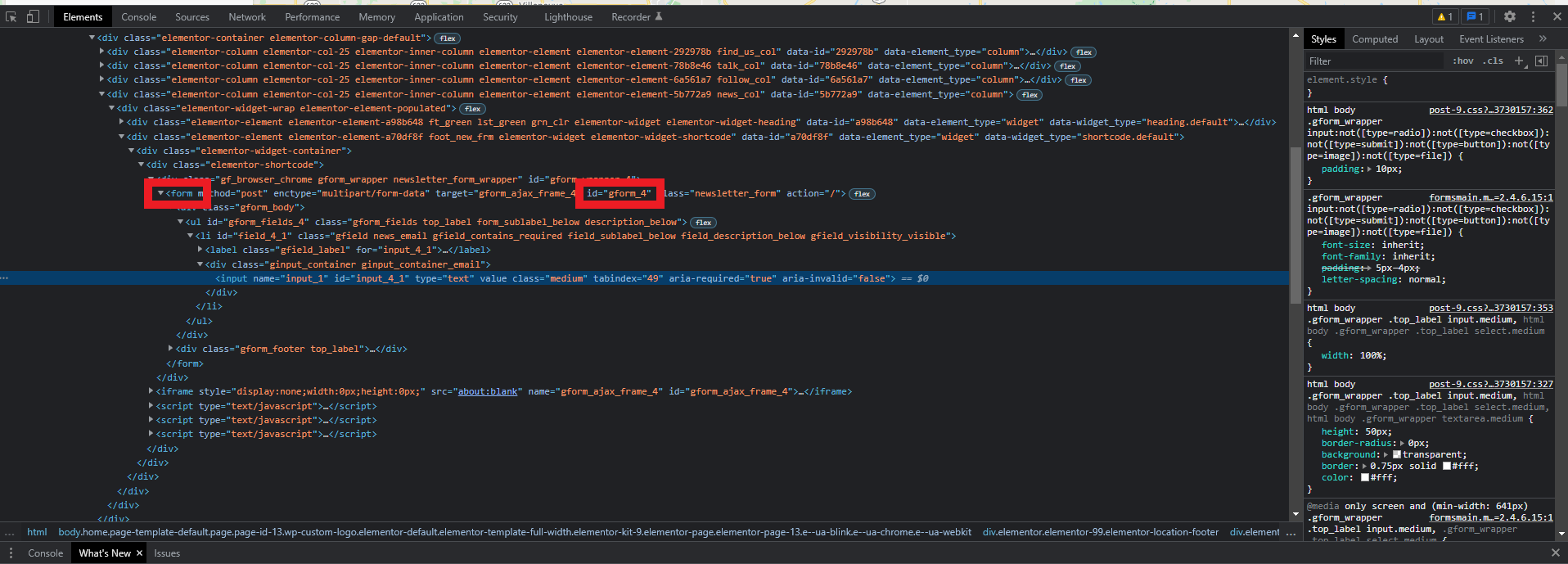 - In the Console that opens up, look for a tag that starts with “<form” and look for the ID=“[formID]” element within that tag.