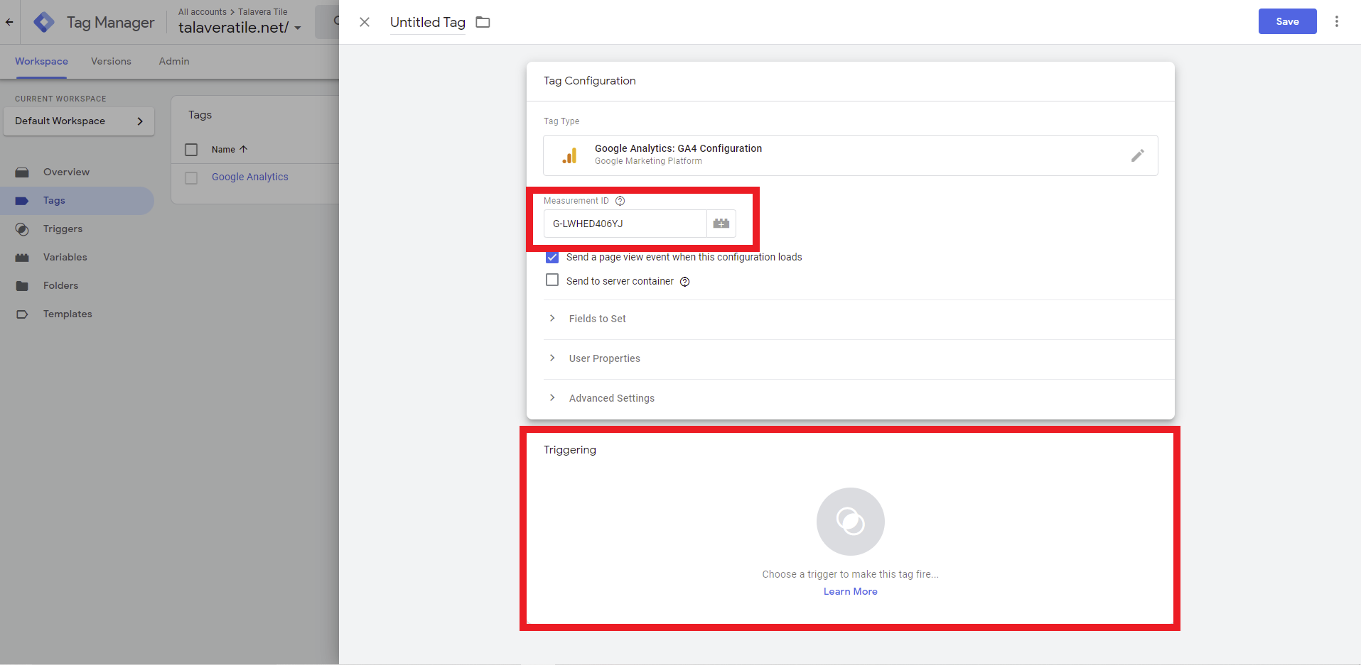 - Switch back to the browser tab with Google Tag Manager open, then paste the Measurement ID into the Measurement ID field on the tag creation screen. Then, click on the Triggering box.