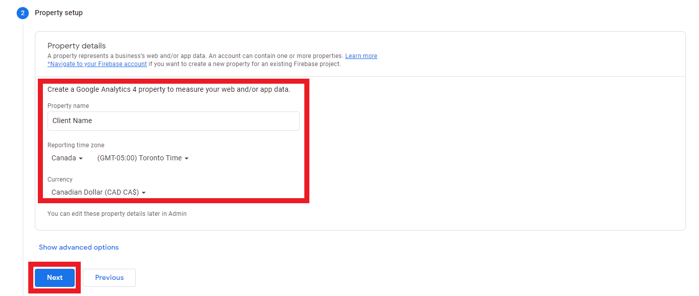 - In the Property Setup section, enter the client’s business name in the Property Name field, then set the reporting time zone to the closest city to where the client’s business is located. Then set the currency to the Canadian Dollar (CAD). then click on “Show advanced options.”