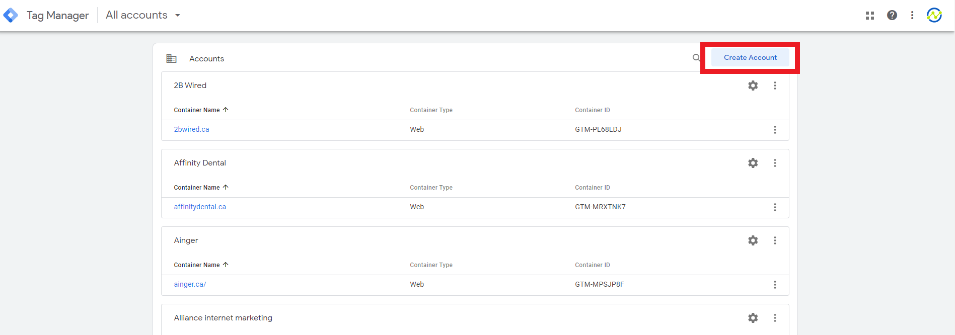 - On the “Add a New Account” screen, enter the client’s business name in the Account Name field. Set the country to Canada. Under Container Setup, enter the client’s website URL. Do not include Error! Hyperlink reference not valid. or any special symbols. Use the format: clientwebsite.ca. Click on “Web” under Target Platform, then click the Create button.